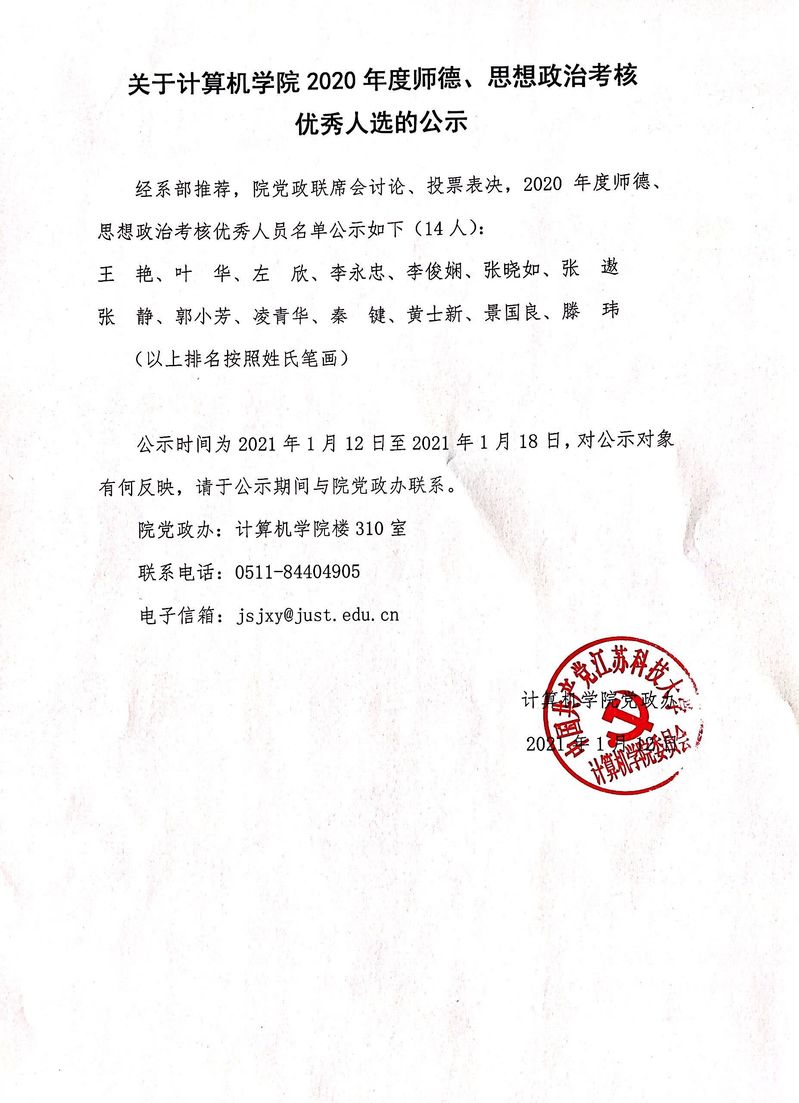 关于计算机学院2020年度师德、思想政治考核优秀人选的公示