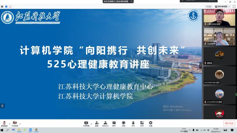 5月13日下午,由江苏科技大学心理健康教育中心、江南手机网页版登录入口,江南(中国)主办的“向阳携行,共创未来”525心理健康教育讲座在计算机学院320会议室顺利开展。本次讲座通过“线上+线下”双平台,邀请校心理健康教育中心专职教师王士凯老师进行《掌握快乐密码之认识内心自我》主题宣讲,旨在帮助同学认识内心自我,驱散烦恼,拒绝迷茫,化解负面情绪,增强抗压能力,重点珍视生命价值。会议由计算机学院心理辅导员刘宝达老师主持,各班级生活委员、心理委员、文体委员及萤火虫义工站义工共五十余人线下参加,近100名同学线上参与。