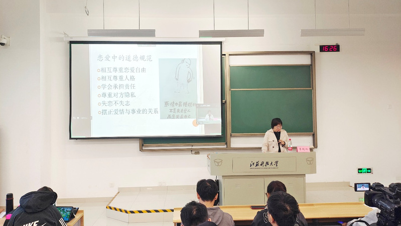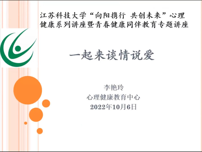 10月6日下午15:30,由江苏科技大学心理健康教育中心、江南手机网页版登录入口,江南(中国)主办的“向阳携行,共创未来”心理健康教育系列讲座在笃学楼108教室顺利开展。本次讲座通过线上线下相结合的形式,邀请校心理健康教育中心专职教师李艳玲老师进行《略谈大学生情感》主题宣讲,旨在帮助学生明确恋爱观,普及性爱安全知识。会议由计算机学院心理辅导员刘宝达老师主持,各班级同学近200人参加。