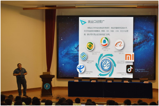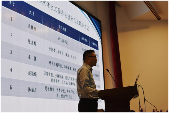 计算机学院党委副书记吴健康则介绍了学工管理的人员配备,给新生提供咨询的服务平台。之后学院的专业负责老师段先华、刘庆华、祁云嵩、于化龙、束鑫老师分别在演讲厅、教3和综B的教室,给对应专业的新生做更具体和富有指导性的学科背景、前沿和行业动态、职业规划等知识分享。