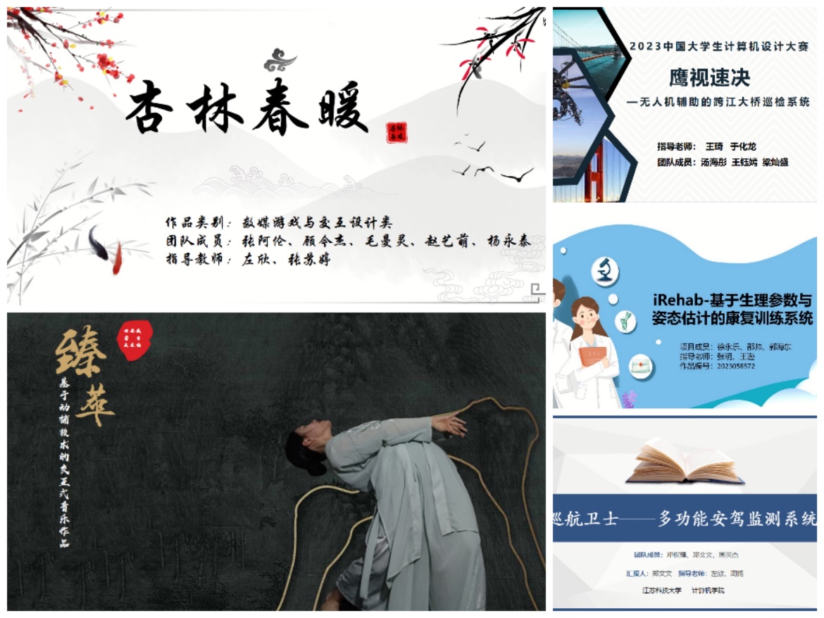 经过各省赛区选拔,全国决赛吸引了全国500多所高校积极参赛。我校共有5支队伍获得全国赛一等奖,它们分别是:人工智能赛道中,由王琦、于化龙老师指导,计算机学院汤海彤等同学创作的《鹰视速决-无人机辅助的跨江大桥巡检系统》以及左欣、周扬老师指导,计算机学院邓全耀等同学创作的《巡航卫士-多功能安驾监测系统》;物联网赛道中,由张明、王逊老师指导,计算机学院徐永乐等同学创作的《iRehab-基于生理参数与姿态估计的康复训练系统》;数媒游戏与交互设计赛道中,由左欣、张苏婷老师指导,计算机学院张阿伦等同学创作的《杏林春暖》;计算机音乐创作赛道中,由陆鑫、吴健康老师指导,计算机学院田睿文等同学创作的《臻萃》,该作品也是我校首次在计算机音乐创作赛道取得突破。