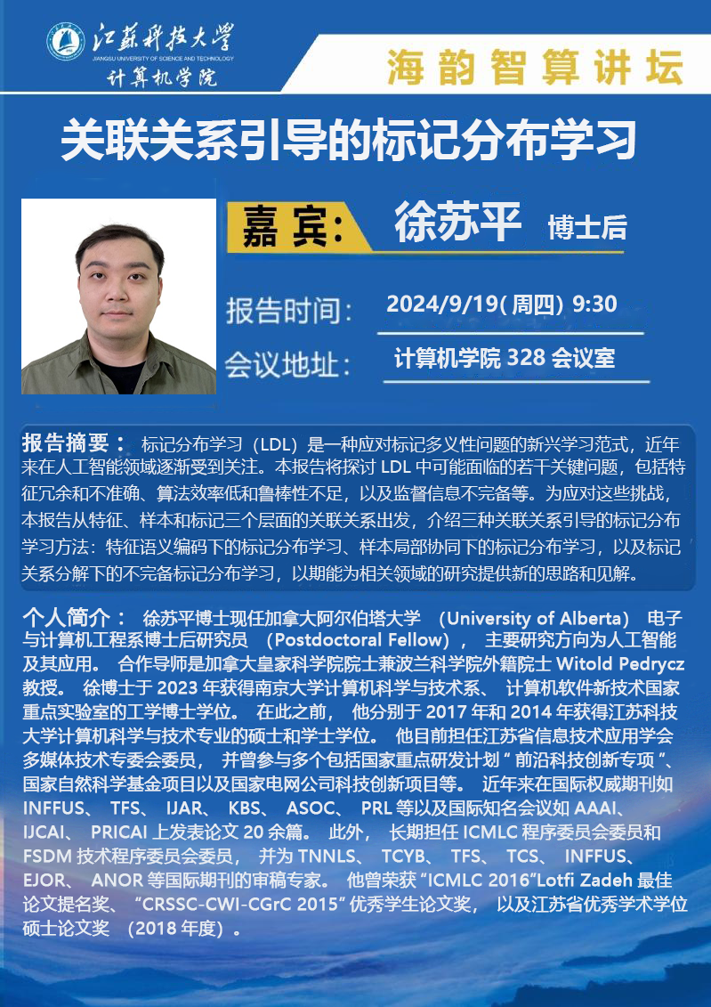 海韵智算讲坛:(徐苏平)关联关系引导的标记分布学习